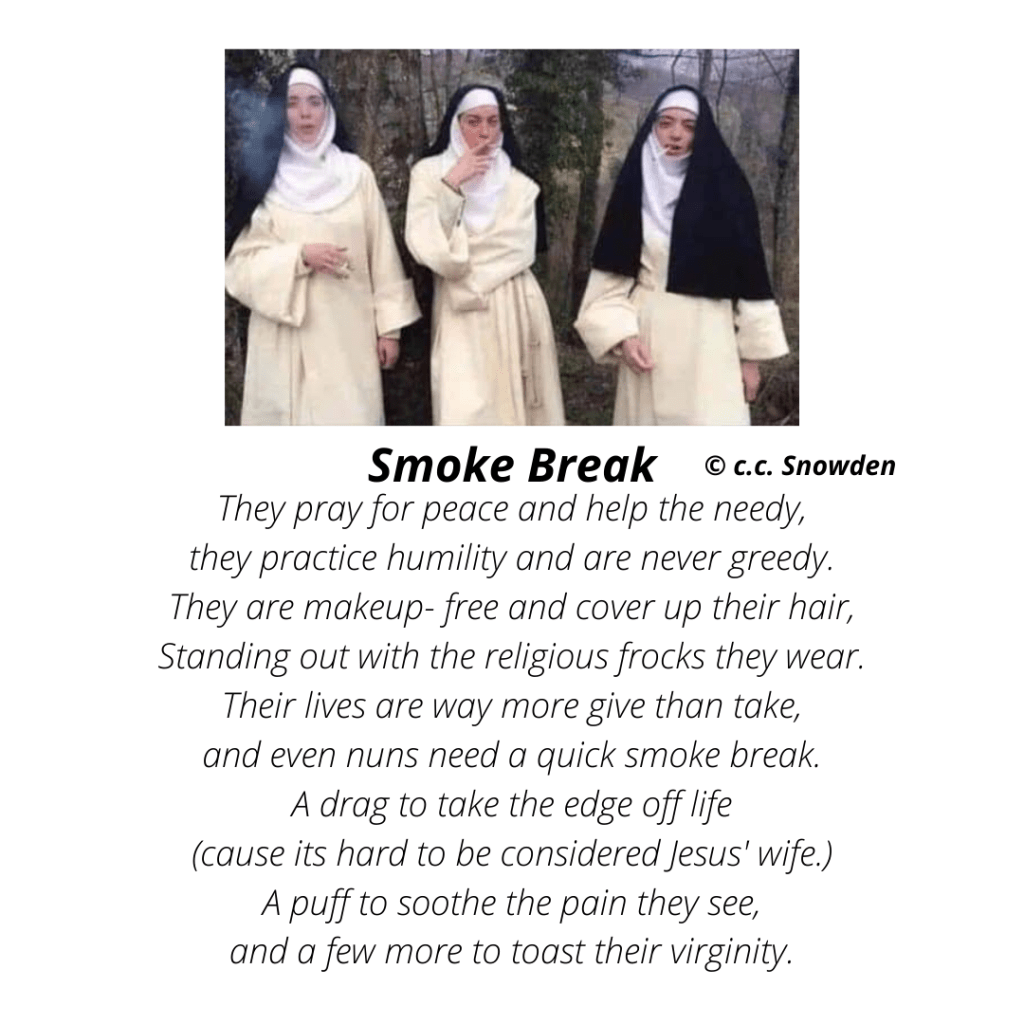 Smoke Break Posted byCarolyn SnowdenMay 20, 2021August 25, 2021Posted inUncategorized Share this: Click to share on X (Opens in new window) X Click to share on Facebook (Opens in new window) Facebook Like Loading... Related